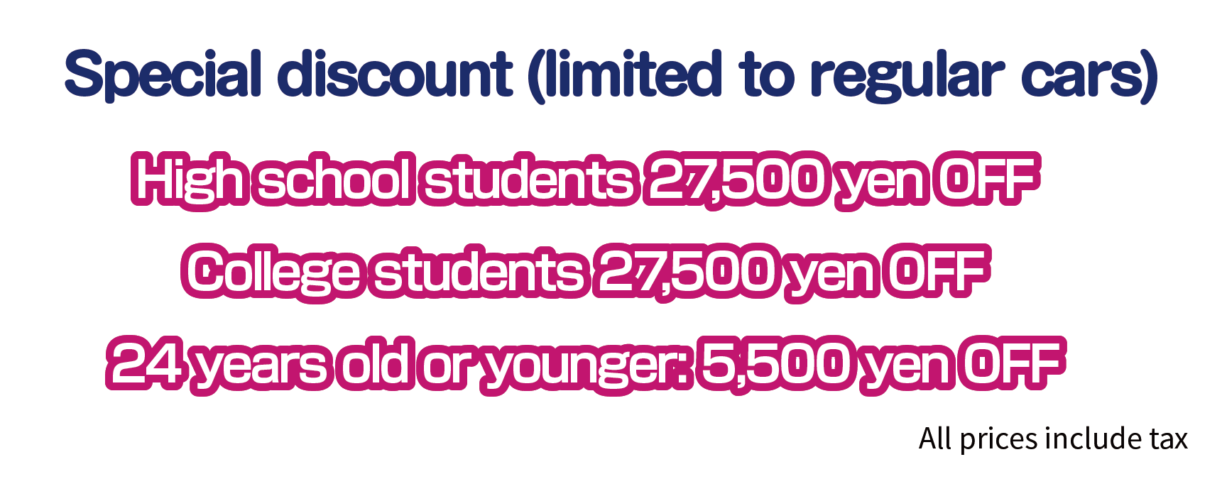 * All prices include tax. A separate fee of 2,850 yen will be charged for the provisional license. (Not required if you have a large driver's license.) )