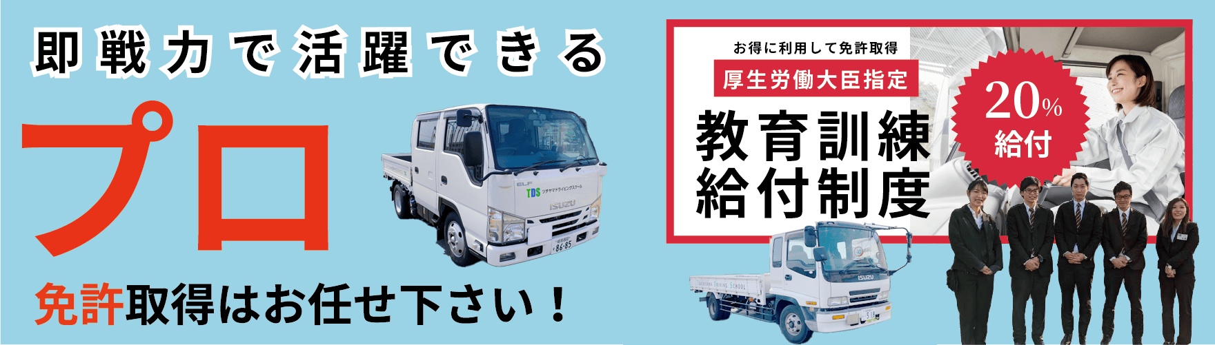 - 教育訓練給付金制度とは、雇用保険の新しい給付制度!当教習所で設定する教育訓練給付金コースの講座を修了した場合、支払った費用の最大20%(上限10万円)がハローワークから支給されます!中型免許・準中型免許を取得予定の人はTDSでお得にプロ免許を取得しよう☆